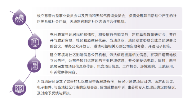 中國海油尊重當地居民的風俗習慣和文化傳統,致力于尊重、捍衛和保護人權,重視生態環境保護,承諾不在保護區內作業,最大限度減小公司運營給當地社區帶來的不良影響。公司遵循自由自愿、事先知情的認可權﹙FPIC)原則,積極開展社區溝通工作,協同當地政府、非政府組織、社區代表等,建立多樣化溝通渠道,通過對話、申訴解決程序和社區影響管理措施,充分了解當地居民對于公司開展生產建設活動的看法與建議,及時評估項目對于社區的影響,識別社區相關潛在風險與機遇。